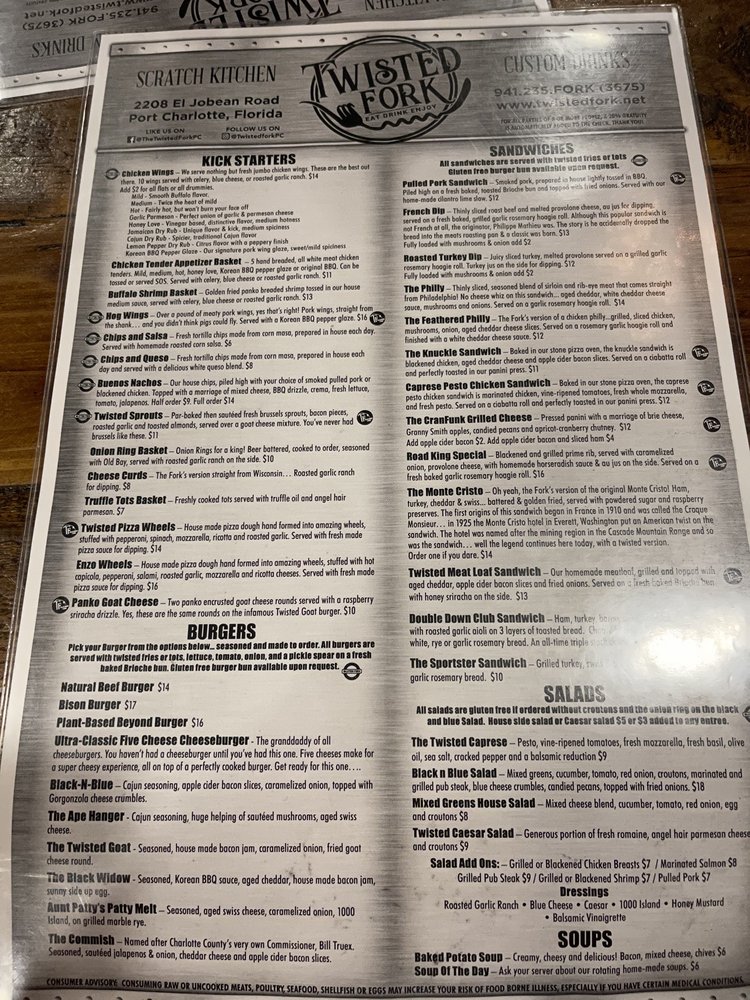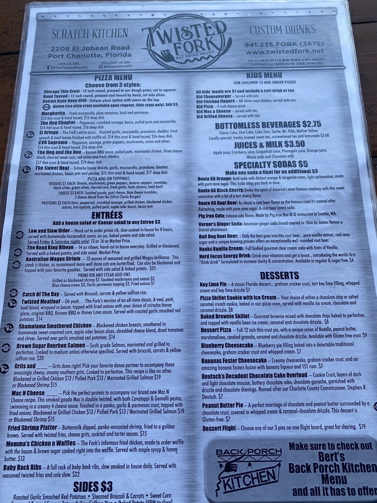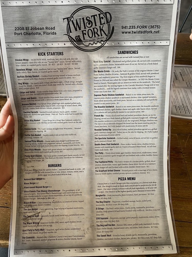 Located in Port Charlotte, Florida, The Twisted Fork is a vibrant bar offering American cuisine with a fun and energetic atmosphere. The menu features a variety of delicious options, including classic omelettes like the Western Omelette and unique Benedicts like the Twisted Benedict. Customers rave about the flavorful dishes, such as the bison black and blue burger, and the five cheese burger. The house margaritas are a must-try and pair perfectly with the live music on Saturday nights. The attentive staff, including servers like Savannah, add to the overall enjoyable dining experience. With offerings like free Wi-Fi, outdoor seating, and happy hour specials, The Twisted Fork is a fantastic spot for groups, kids, and even dancing. Don't miss out on this exciting dining destination!